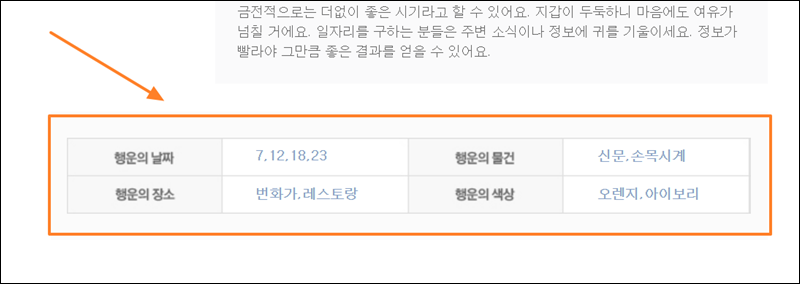 매일마다 행운을 가져다 주는 시간, 색상, 물건, 장소도 알아볼 수 있어요. 손거울, 스카이블루, 맛집, 오전 11시가 행운의 열쇠를 의미하네요.