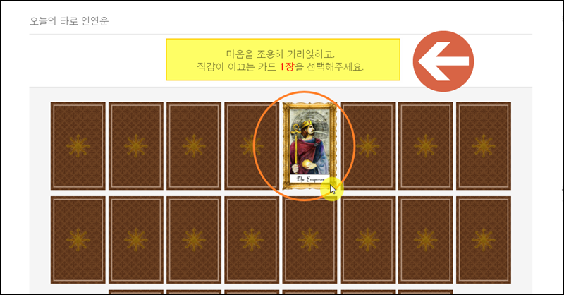 네이트 사이트에서는 타로 카드를 이용한 운세도 볼 수 있는데요. 마음을 조용히 가라앉힌 상태에서 마음이 이끄는 대로 카드를 한 장 뽑아보세요.