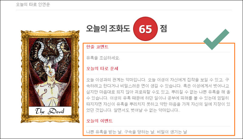 방금 뽑은 타로 카드에 관련된 해석을 읽어볼 수 있는데요. 오늘의 조화도 점수, 타로 운세 풀이, 오늘의 이벤트 내용을 확인할 수 있어요. 일일이 읽어볼 시간이 없는 분들은 "한줄 코멘트"만이라도 읽어보면 시간을 아끼면서도 점괘 결과 확인을 할 수 있어요.