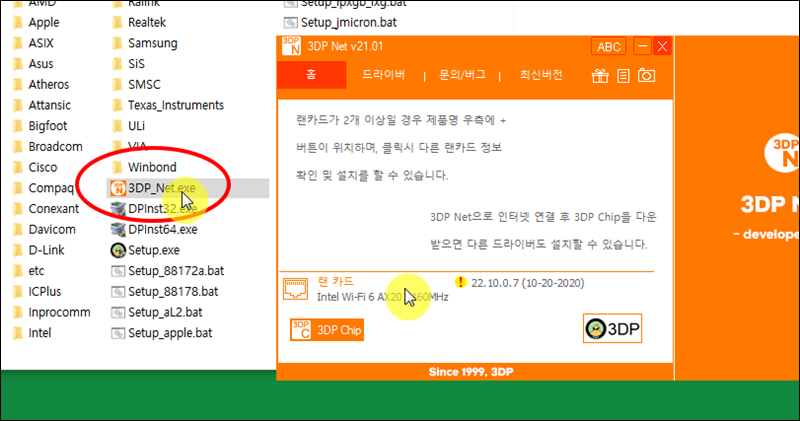 3dp net을 실행해 보았어요. 이 때 프로그램 화면 하단을 보면 자동으로 인식된 랜카드 이름이 나타나는데요. 해당 이름을 클릭해 보세요.