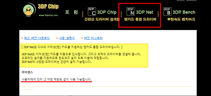 하드웨어 전용 드라이버는 노트북 제조사 사이트에서 다운 받을 수 있는데요. 일일이 찾기 번거로운 분들을 위해 3dp net을 추천 드릴게요. 무료로 사용할 수 있는 랜카드 통합 드라이버에요.
