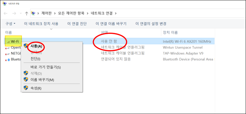네트워크 연결 창을 통해 노트북에서 사용할 수 있는 네트워크 목록을 살펴볼 수 있는데요. 무선 인터넷 연결이 안될때 Wi-Fi 부분을 보면 "사용 안 함"으로 되어 있을 수 있어요. 이런 때에는 Wi-Fi에 마우스 우클릭을 한 후 "사용"으로 변경해 주세요.