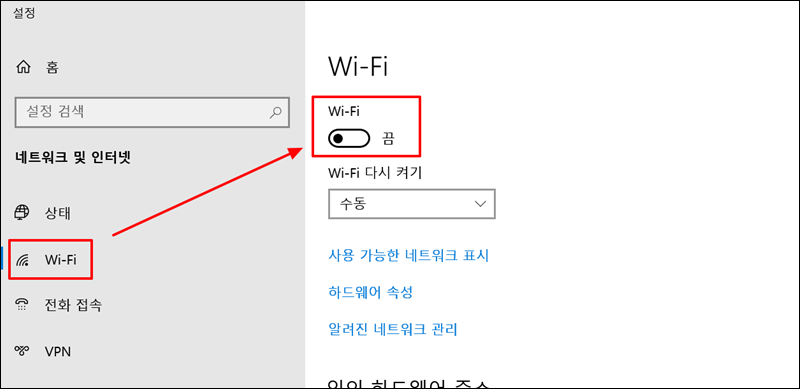 "네트워크 및 인터넷" 창이 열렸는데요. 여기에서 Wi-Fi를 선택해 보세요. 지금까지 노트북 와이파이 연결이 안될때 여기는 보면 "끔"으로 되어 있을 거에요. 해당 부분을 클릭하여 "켬"으로 변경해 주세요.