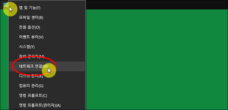 드라이버를 잡았으니 이번에는 윈도우 설정을 통해 와이파이 연결을 시도해 볼게요. 노트북을 재부팅한 후 "시작" 버튼에 마우스 우클릭을 해보세요. 그럼 여러 가지 메뉴가 나타나는데요. 여기에서 "네트워크 연결"을 클릭하면 돼요.