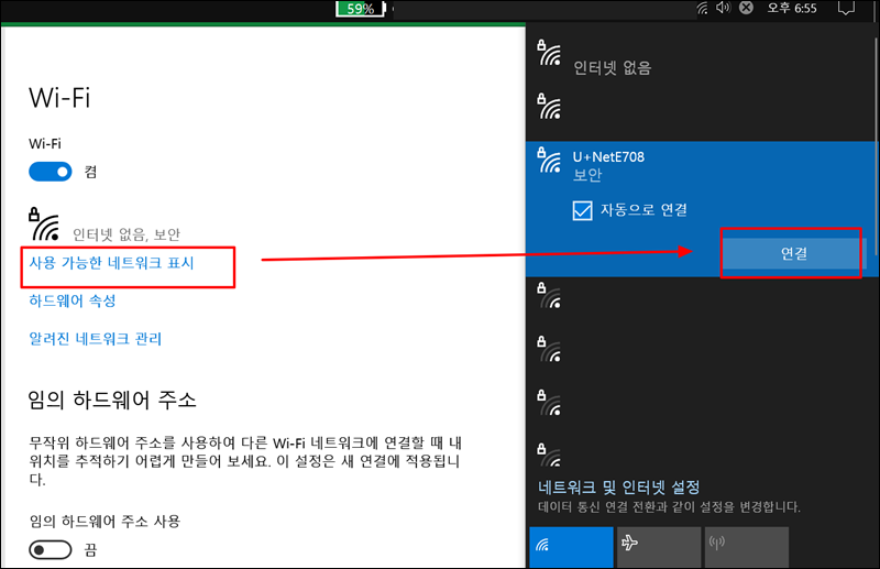 노트북의 와이파이 기능이 켜진 상태에서 "사용 가능한 네트워크 표시"를 클릭해 보세요. 그럼 윈도우 작업표시줄 부분에 와이파이 연결이 가능한 여러 가지 공유기 이름이 나타나는데요. 여기에서 본인 소유의 공유기나 비밀번호를 알고 있는 공유기를 선택한 후 "연결" 버튼을 눌러 주세요.