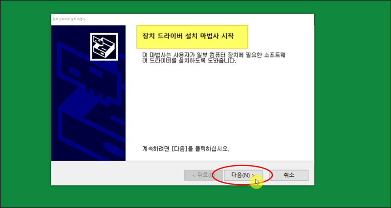 장치 드라이버 설치 마법사가 시작이 되는데요. 다음 버튼을 누르면 노트북 랜카드에 대한 드라이버 설치가 진행돼요.