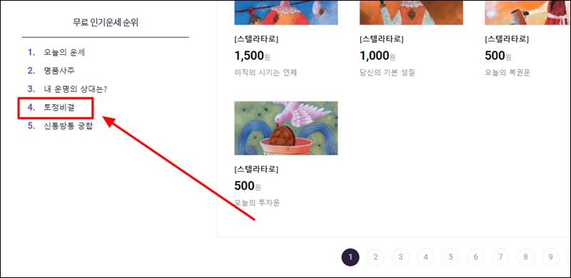 사이트 메인화면에서 맨 아래 화면으로 쭉 내려보세요. 그 다음 "더보기" 버튼을 눌러보세요. 그럼 좌측에 무료 인기운세가 나타나는데요. 행운의 번호를 알아보려면 4위를 차지하고 있는 토정비결을 선택해 주세요.