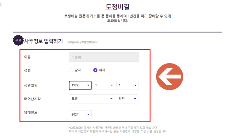 토정비결은 많은 사람들이 아는 바와 같이 한 해 동안 어떤 운이 들어오는지 알려주는 역술인데요. 토정비결을 통해 내게 행운을 가져다 줄 숫자도 알아볼 수 있어요. 이름, 성별, 생년월일, 태어난시각을 입력해 주세요.
