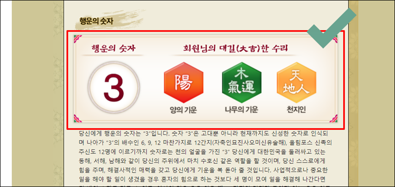 토정비결을 통해 총운, 월별세운, 애정운, 재물운 등을 살펴볼 수 있는데요. 풀이를 보다보면 행운의 숫자를 찾을 수 있어요. 이번에는 숫자 3인 나왔네요.