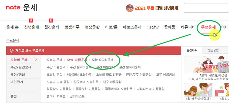 네이트 운세 사이트에서 "무료운세" 메뉴를 선택해 보세요. 그럼 여러 가지 오늘의 운세를 볼 수 있는 서비스가 나타나는데요. 여기에서 오늘의 별자리 운세를 선택해 주세요.