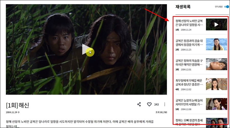 해신을 선택해 보았는데요. 오른편에 있는 재생목록을 보면 1회부터 끝까지 볼 수 있게 해놓았어요.