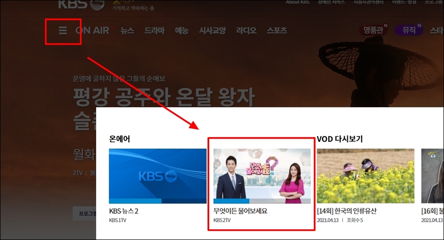 화면 중앙에 실시간 방송보기 할 수 있는 온에어 서비스와 지난 프로그램을 다시 볼 수 있는 VOD 다시보기 서비스가 나타날 거에요. 현재 kbs2 채널에서 "무엇이든 물어보세요"가 방영 중인데요. 클릭해 주세요.