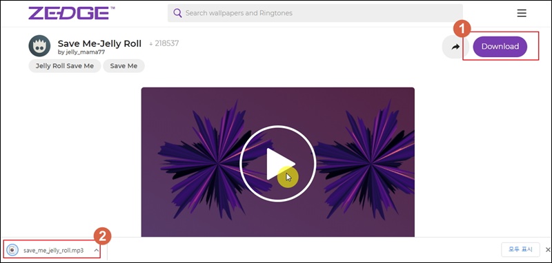 음원 타이틀을 클릭하면 해당 음원을 다운 받을 수 있는 페이지로 이동하게 됩니다. 여기에서 중앙에 있는 재생 버튼을 누르면 미리 듣기를 할 수 있고, 우측 상단에 있는 Download 버튼을 누르면 mp3 파일로 음원을 내려 받을 수 있습니다.