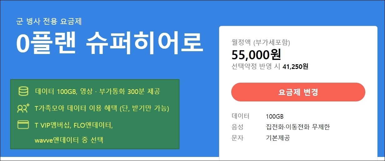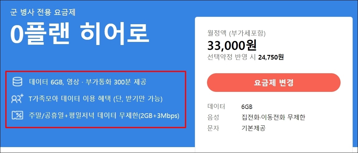 SKT에서는 2가지의 군 병사 전용 요금제 서비스를 제공하고 있습니다. 첫 번째는 0플랜 히어로입니다. 부가세 포함하여 월 33,000원, 선택 약정 반영 시 24,750원에 이용할 수 있습니다. 간단히 살펴보면 6GB의 데이터 용량과 무제한 이동전화, 집전화, 문자를 제공하고 있죠.