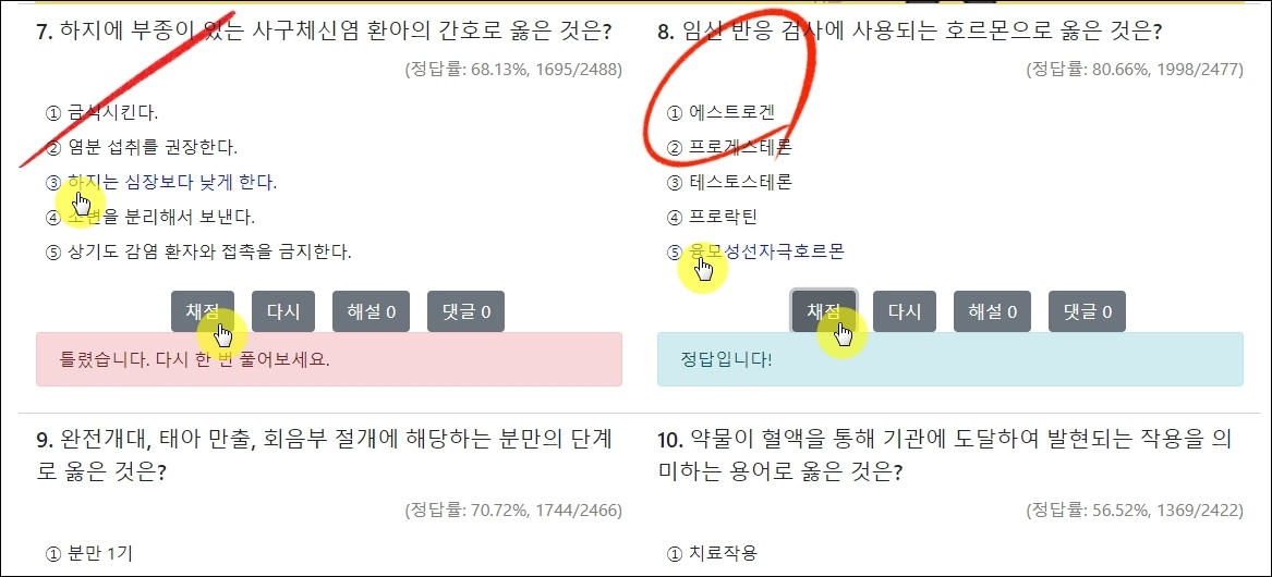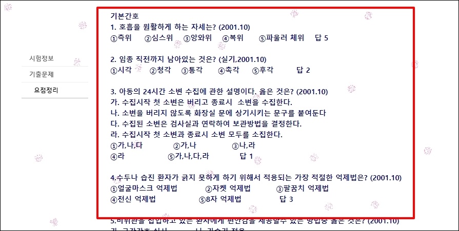이곳에서 제공하는 간호조무사 시험 요점 문제도 이용해 보세요. 답이 표시되어 있기 때문에 첫 번째 기출문제 서비스처럼 풀어보기는 어렵습니다. 그래도 핵심이 되는 것만 모아 놓았기 때문에 공부하기에 유용합니다.