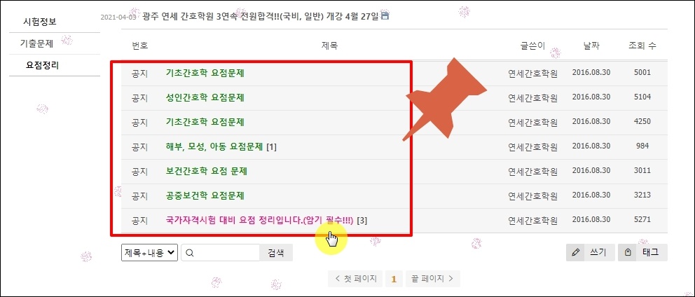 새롭게 열린 페이지에서 보면 요점 기출문제와 요점 정리 자료로 구성된 게시판이 하나 나타납니다. 여기에서 요점 정리를 클릭하면 암기를 하기에 좋은 간호조무사 정리 내용을 만나볼 수 있습니다.