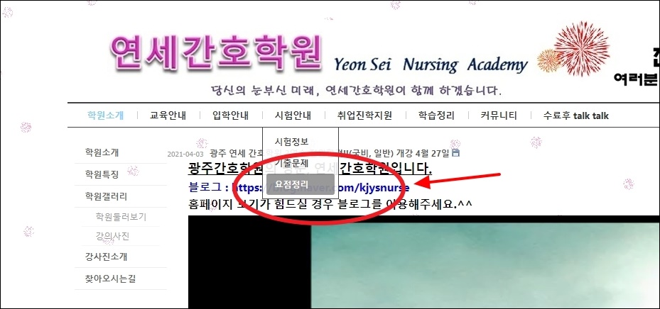 여러 학원 사이트에서 사이트 방문자를 위해 시험 준비에 도움이 되는 자료를 제공하는 경우가 있습니다. 광주에 있는 연세간호학원의 경우 홈페이지를 통해 요점정리 자료를 제공하고 있습니다.