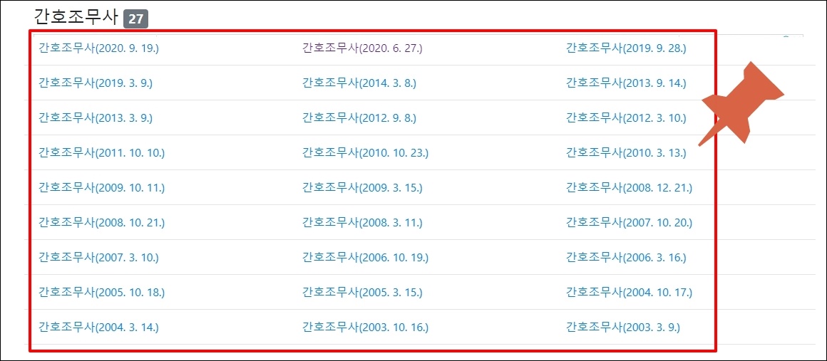 2003년부터 2020년 9월까지 시행된 간호조무사 시험 기출문제를 선택할 수 있는 페이지가 열렸습니다. 풀어보고 싶은 회차를 선택하면 됩니다.