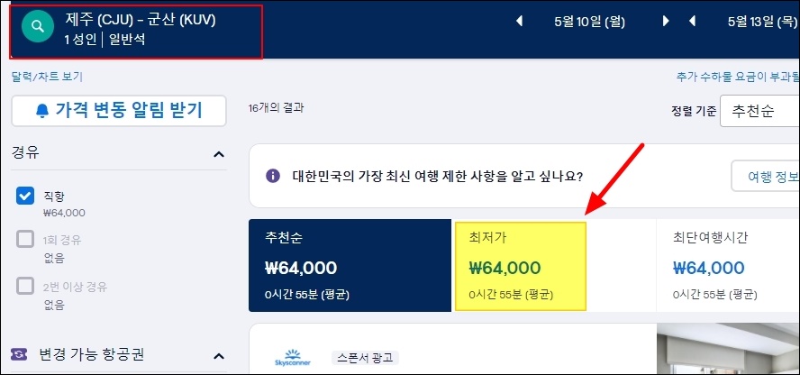 참고로 비행기표 가격은 시기에 따라 변동이 있어요. 금일 기준으로는 제주에서 군산으로 가는 최저가 티켓을 구하면 64,000원에 예약이 가능해요. 비행시간은 평균적으로 55분 걸리고요. 이보다 더 싸게 구하는 방법도 있는데요. 하나씩 따라해 보세요.