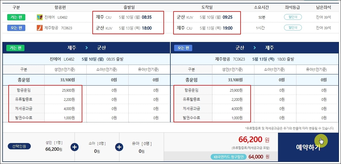 제주에서 군산으로 다녀올 수 있는 왕복항공권을 예약할 수 있는 사이트가 열렸어요. 여기에서 항공운임, 제세공과금, 발권수수료, 출발일, 도착일 등을 꼼꼼히 확인한 후 안내에 따라 예약을 진행하면 돼요. 참고로 마음에 드는 항공권을 못 찾은 경우에는 시간이 좀 흐른 다음에 다시 찾아보세요. 수시로 가격이 변하기 때문에 마음에 드는 티켓을 발견할 수 있을 거에요.