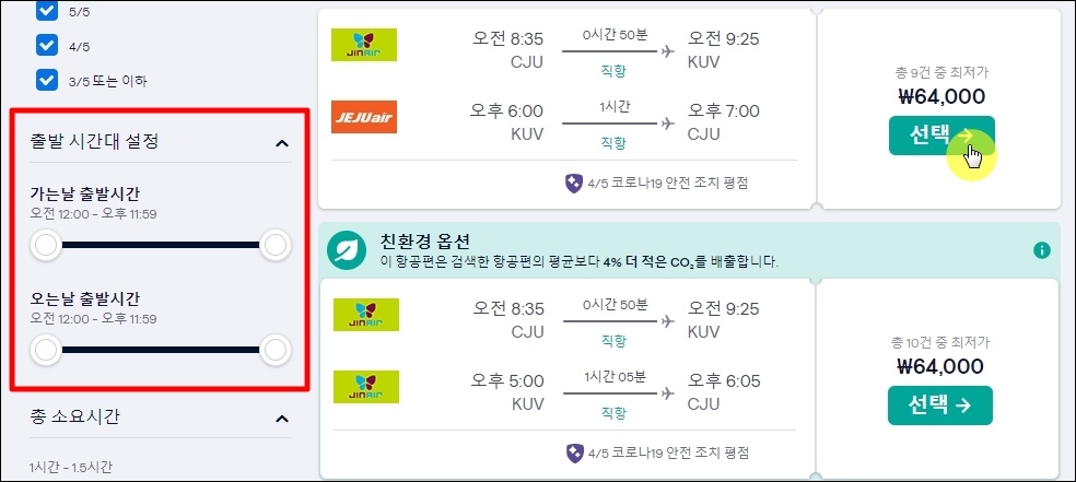 날짜 선택을 한 이후에는 비행기 탑승 시간을 정해야 해요. 저렴한 특가 항공권을 이용하고 싶다면 사람들이 많이 이용하는 시간대를 피하는 것이 좋아요. 일일이 항공편의 탑승 시간을 확인할 필요 없이 좌측에 있는 "출발 시간대 설정" 기능을 사용하면 돼요. 그럼 간편하게 해당 조건에 맞는 티켓 중에서 고를 수 있어요.