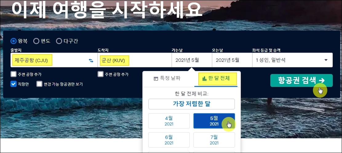 특가 항공권을 구하고 싶다면 여기서 가는날과 오는날을 한 달 단위로 지정하는 것이 좋아요. 저는 2021년 5월을 선택했는데요. 이렇게 하면 5월에 가장 저렴하게 제주에서 군산으로 다녀올 수 있는 항공권을 구할 수 있어요.