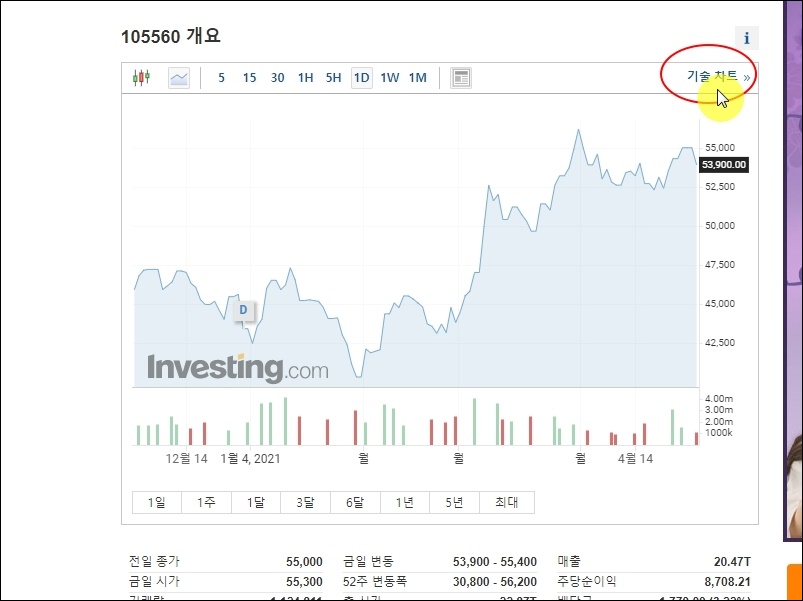 인베스팅 홈페이지에 접속하면 메뉴에서 "시장", "주식", "한국"을 차례대로 클릭해 주세요. 이곳에서는 한국 외에도 미국, 유럽 등 여러 나라의 주식 차트를 보는 것도 가능합니다.