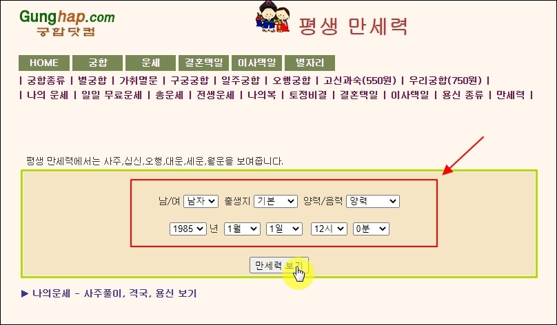 이곳에서 이용할 수 있는 역술 서비스는 대부분 무료인데요. 메뉴에서 가장 오른쪽에 만세력이 있습니다.