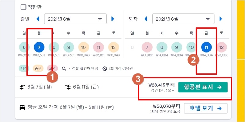 날짜 선택에서 "한 달 전체" 단위로 지정했다면 이렇게 일별로 최저가 항공권의 가격을 알아볼 수 있습니다. 여행 날짜를 조절할 수 있는 상황이라면 여기 나온 가격 정보를 활용하면 좋습니다. 날짜에 따라 서울에서 광주 항공권의 가격 차이가 2배 넘게 차이가 나기도 하거든요. 날짜를 선택했다면 항공편 표시 버튼을 누릅니다.