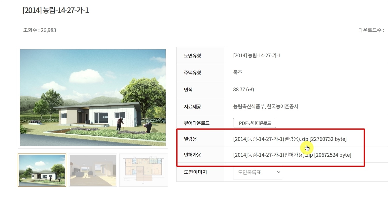 새롭게 열린 페이지를 보면 좌측에 전원주택 사진을 확인할 수 있어요. 하나의 설계도에 외관과 내부 사진을 살펴볼 수 있는데요. 열람용 자료를 다운 받아서 열어보면 좀 더 많은 자료 모음을 만나볼 수 있어요.