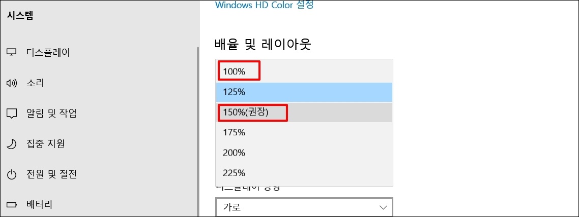 노트북의 경우에는 모니터 화면이 작기 때문에 배율이 높은 것을 많이 사용합니다. 15인치의 경우에는 110~120%, 13인치의 경우 150%을 많이 사용하는데요. 사용자마다 선호하는 배율이 있기 때문에 하나씩 화면크기조절을 해보면서 자신에게 맞는 것을 선택하면 됩니다.