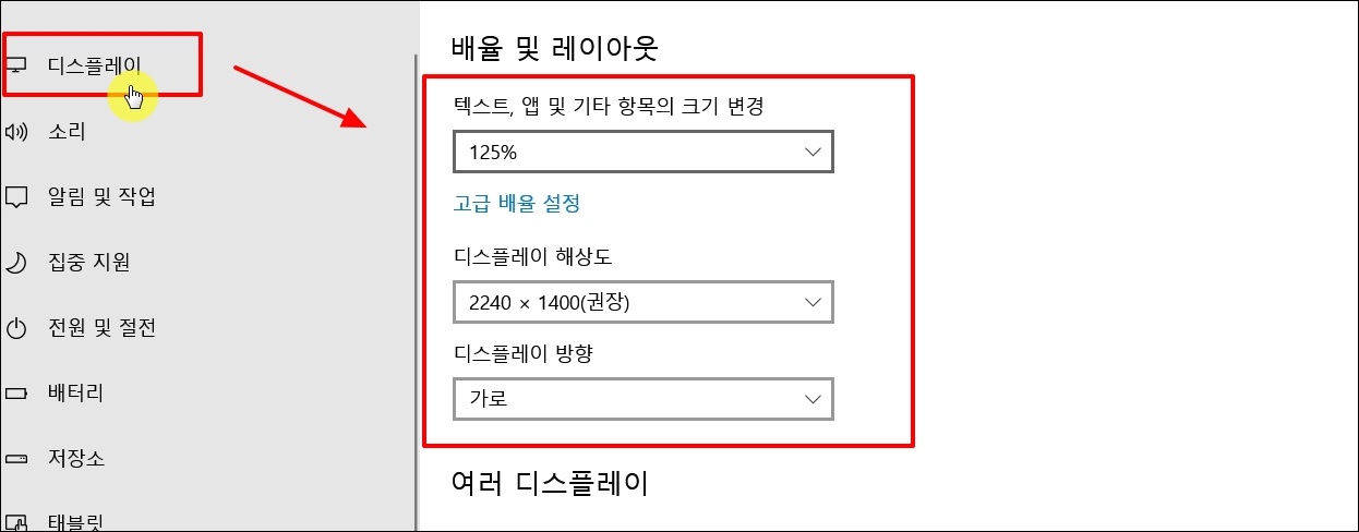 새롭게 열린 창에서 좌측에 있는 "디스플레이" 메뉴를 클릭합니다. 그럼 배율 및 레이아웃을 설정하는 부분이 나타나는데요. 여기에서 텍스트, 앱 및 기타 항목의 크기 변경, 디스플레이 해상도, 디스플레이 방향을 지정할 수 있습니다.