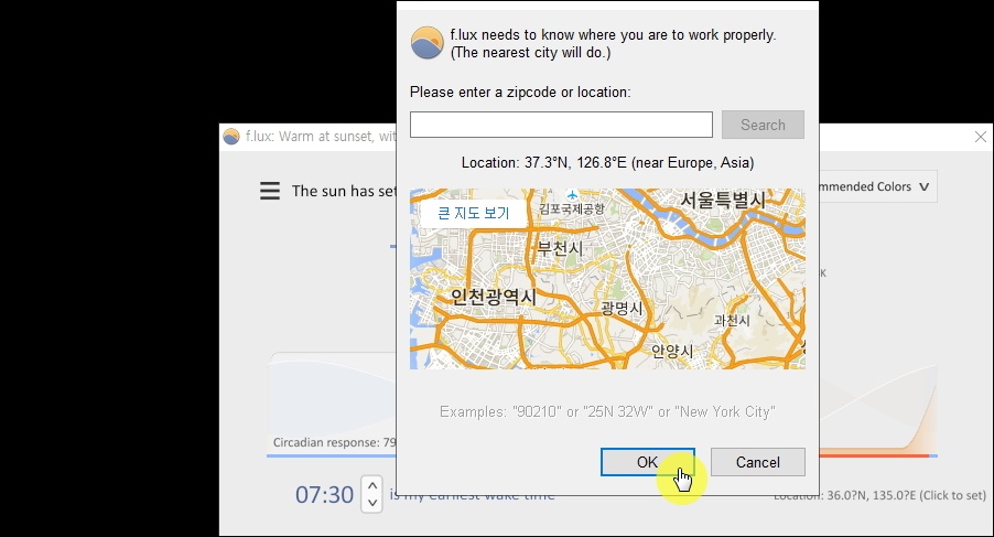 처음 f.lux 프로그램을 실행하면 위치 지정을 하라고 나타납니다. 그냥 OK 버튼을 누르면 넘어갑니다. 해 뜨는 시각에 따라 자동으로 윈도우10 모니터 발기 조절을 하고 싶은 경우에는 정확한 위치를 지정해주면 됩니다.