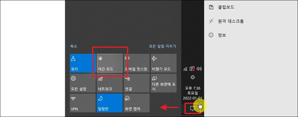 해당 방법의 경우에는 노트북에서만 될 가능성이 높습니다. 왜냐하면 제가 지금 사용하고 있는 데스크탑에서는 안되기 때문입니다. 그래도 데스크탑에도 약간 어둡게 만들 수 있어요. 작업표시줄에서 가장 끝에 있는 알림 버튼을 클릭해 보세요. 그럼 새로 나타난 바 하단에 밝기 조절 바가 나타납니다. 저처럼 데스크탑을 사용하는 경우에는 모니터 밝기 조절 바가 나타나지 않는데요. 데스크탑에서는 "야간 모드" 기능을 이용하면 됩니다. 그럼 미세하게 조절은 하지 못하더라도 약간 어둡게 만들 수 있습니다.