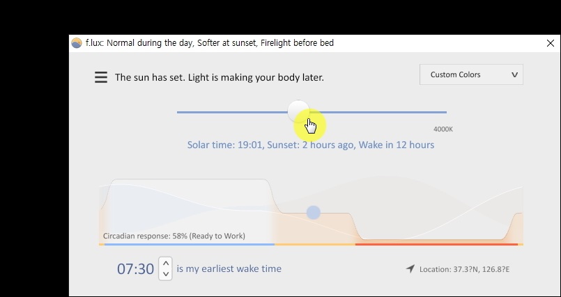 f.lux 프로그램을 실행했습니다. 프로그램 상단을 보면 밝기 조절 바가 있습니다. 좌측, 우측으로 바를 옮겨보면 어둡거나 밝아지는 것을 확인할 수 있습니다. 해당 프로그램은 모니터 화면을 오래 볼 때 사용자가 피로한 것을 예방하기 위해 만들어 졌는데요. 눈 건강을 위해 사용하면 정말 좋습니다.