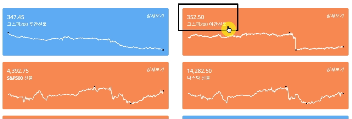 사이트에 접속하면 메인화면에 몇 가지 지표를 선택할 수 있는데요. 낮에 바로 확인이 가능한 코스피 200 주간선물이 있고, 그 다음으로 우리가 찾고 있던 코스피 200 야간선물 서비스가 있습니다. 그 다음으로는 미국의 S&P500과 나스닥 선물지수를 알아볼 수 있는 서비스가 마련되어 있죠.