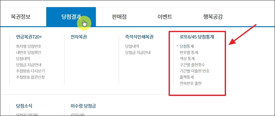 이번에는 분석자료 보는 방법을 알려드리겠습니다. 동행복권 홈페이지에서 메뉴에 있는 [당첨결과]를 클릭합니다. 그럼 로또 6/45 당첨통계 메뉴를 찾을 수 있습니다. 해당 메뉴를 클릭합니다.