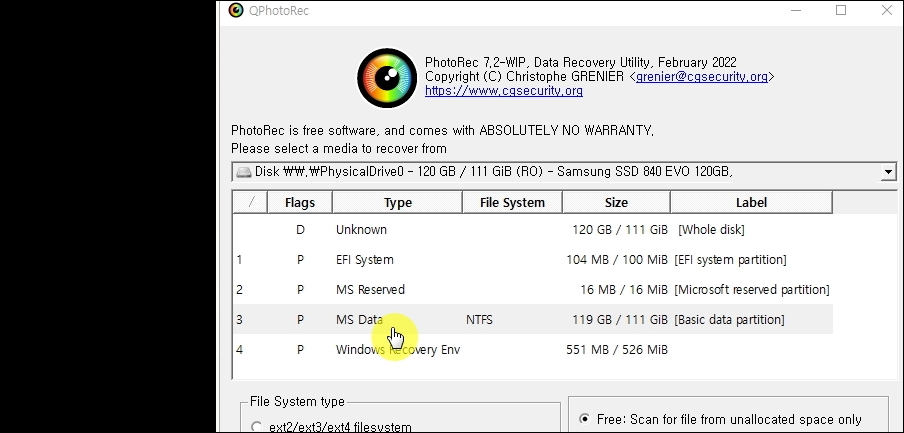 QphotoRec 프로그램이 실행해 봅니다. 프로그램이 열리면 가장 먼저 해야 할 것은 usb 디스크를 선택하는 일입니다. 컴퓨터에 usb를 연결한 후, qphotorec에서 지정하면 됩니다. File System type도 usb에 맞게 설정해주시길 바랍니다.