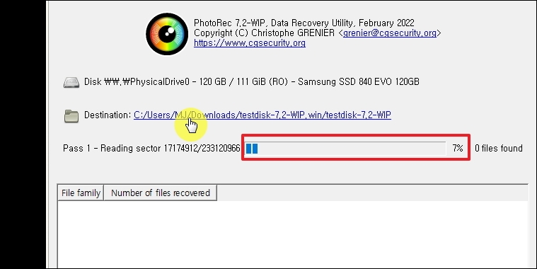 Reading sector 옆 부분을 보면 얼마나 작업이 진행되었는지 확인이 가능합니다. 진행 상황이 100%가 되면 좀 전에 지정한 폴더를 열어봅니다. 그럼 그곳에 삭제한 usb 파일을 만나볼 수 있을 겁니다.