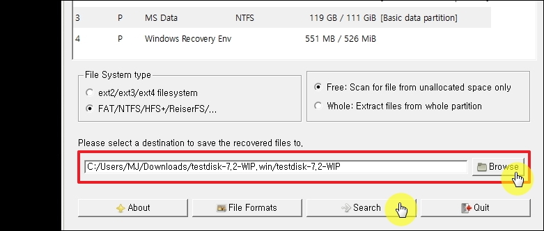 마지막으로 복구한 usb 파일을 저장할 폴더를 지정합니다. [Browse] 버튼을 클릭하면 폴더의 주소를 지정할 수 있습니다. 여기까지 마쳤다면 [Search] 버튼을 눌러 파일 복구 작업을 진행합니다.