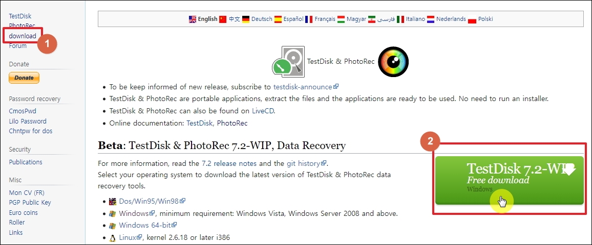 usb 파일 복구 프로그램을 다운로드 받는 방법을 알려드리겠습니다. CGSeurity 사이트에 접속하면 좌측에 있는 "download" 메뉴를 클릭합니다. 그럼 이곳에서 제공하는 프로그램이 여러 개 나타납니다. 이 중에서 "TestDisk 7.2"를 선택하면 됩니다.