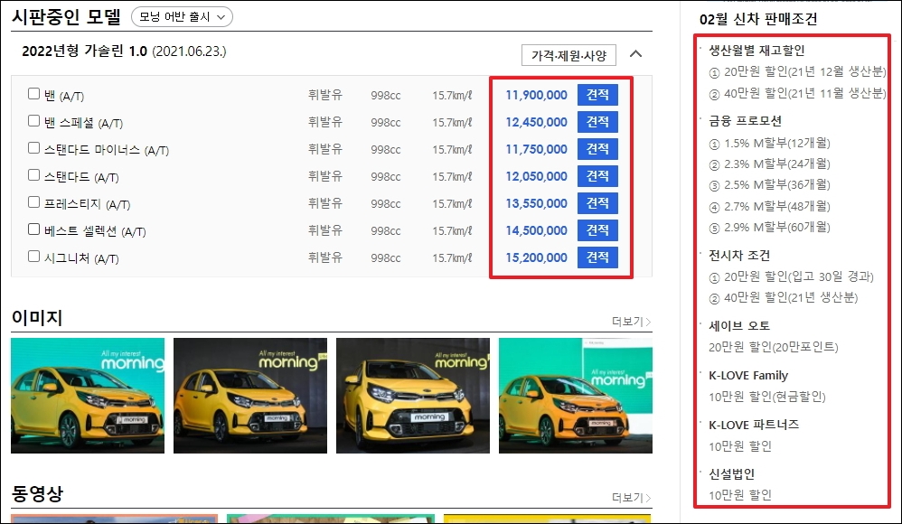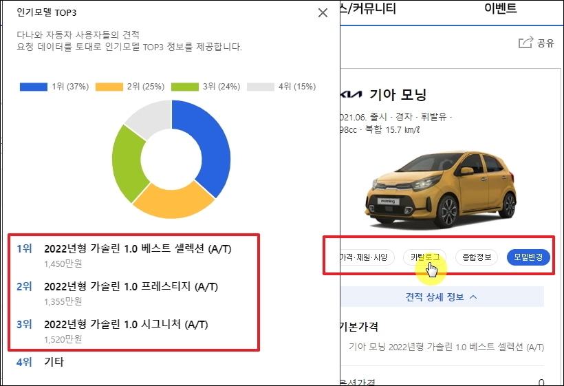 ▼제가 기아자동차 모닝신차가격표 최신정보를 얻는 곳은 다나와 자동차 사이트입니다. 이곳의 견적 시스템이 꽤 잘되어 있어서 바로 최신 가격표 확인이 가능합니다.