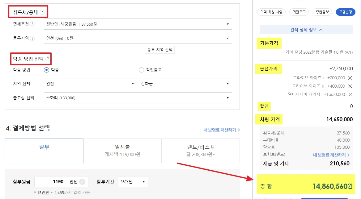 ▼마지막으로 취득세, 공채, 탁송에 관련 조건을 설정합니다. 이렇게 모두 선택하고 나면 사이트 우측에 있는 신차가격표를 통해 가아자동차 모닝에 대한 최종 구매 비용을 확인할 수 있습니다. 실제로 모닝 신차를 구매할 때 해당 금액과 거의 차이가 나지 않을 겁니다.