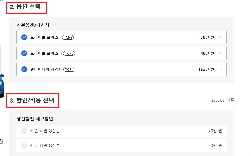 ▼이번에는 옵션과 할인 및 비용에 대한 선택을 할 차례입니다. 모닝의 경우 드라이브 와이즈 설정이 가능합니다. 안전하고, 편리한 운행을 할 때 필수라고 생각합니다.