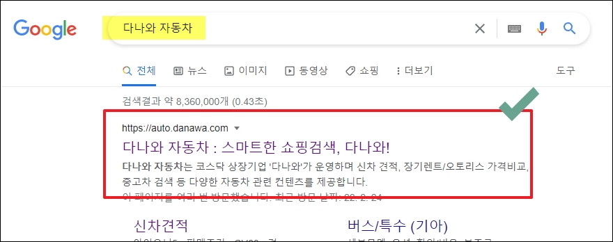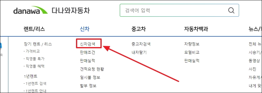 ▼다나와 자동차 사이트에 접속하면 메뉴에서 "신차 검색"을 클릭합니다. 메뉴에서 보면 알 수 있듯이 렌트나 리스, 중고차, 차량 정보에 관련된 서비스도 제공하고 있습니다.