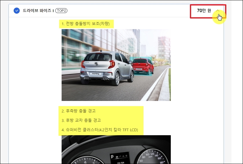 ▼기아자동차에서 정한 옵션명이 무엇을 의미하는지 모를 수 있습니다. 이럴 때에는 가격표 옆에 있는 화살표를 클릭합니다. 그럼 해당 옵션에 대한 설명 확인이 가능합니다.
