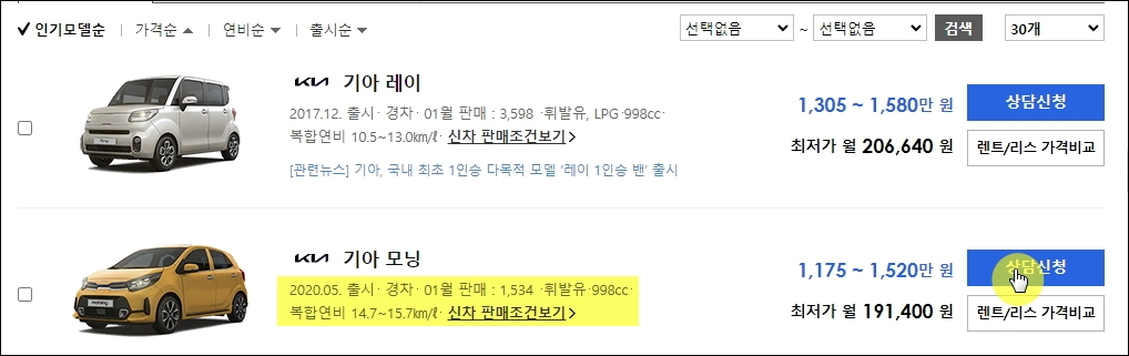 ▼검색 결과가 나왔습니다. 기아자동차 경차 조건을 입력했기 때문에 모닝과 더불어 레이에 대한 신차가격표가 나왔습니다. 금액이 범위로 되어 있어서 정확하게 확인이 어렵습니다. 이럴 때에는 [상담신청] 버튼을 누르면 꽤 구체적인 가격표 확인이 가능합니다. 참고로 [신차 판매조건보기]를 클릭하면 기아자동차가 매달 진행하는 최신 판매조건 정보를 확인할 수 있습니다.