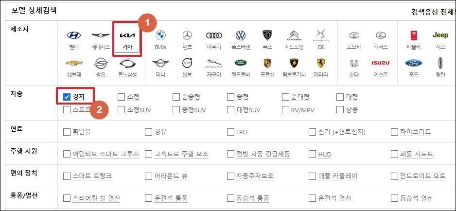 ▼신차 검색 페이지가 열렸습니다. 여기에서 모델 상세검색을 통해 모닝을 찾으면 됩니다. 제조사는 기아자동차를 체크하고, 차종은 경차를 선택하면 됩니다. 이외에 연료 타입, 주행 지원, 편의 장치, 통풍, 열선 조건을 지정하면 이에 맞는 기아자동차 모델을 찾을 수 있습니다.