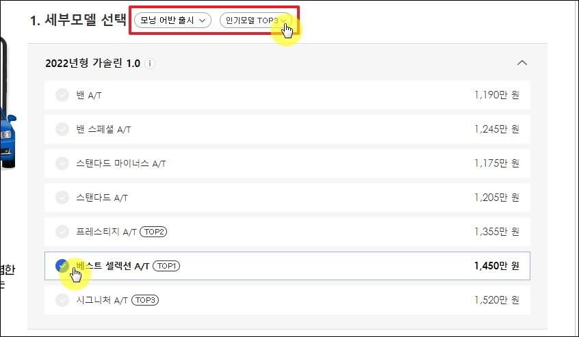 ▼새롭게 열린 페이지에서는 세부모델, 옵션, 판매조건 등을 선택하면 정확한 기아자동차 모닝신차가격표 확인이 가능합니다. 가장 먼저 세부모델 선택입니다. 이름만 보고는 무엇이 괜찮은지 알 수 없습니다. 정해 놓은 세부모델이 없는 경우에는 [인기모델 TOP3]를 클릭해 봅니다.