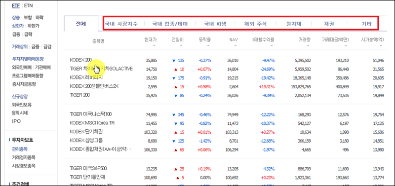▼국내 시장지수, 업종, 테마, 원자재, 채권 등 여러 상품에 관련된 ETF에 대해 알아볼 수 있습니다. 아무래도 ETF를 선택할 때에는 거래량, 거래대금을 감안하여 선택하는 것이 좋습니다. 그래야 매수 및 매도가 수월하기 때문입니다.